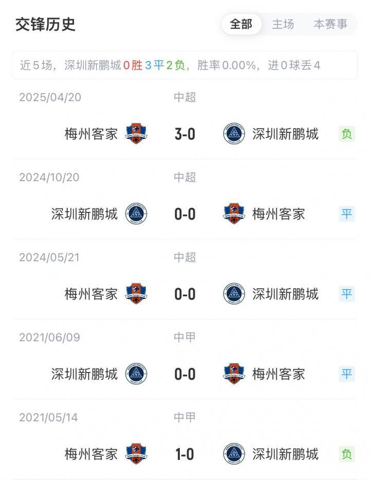 目前,新鹏城5胜2平15负积17分暂列中超第14,球队近期遭遇5连败;梅州4胜5平13负积17分暂列中超第13,球队近两轮不胜。